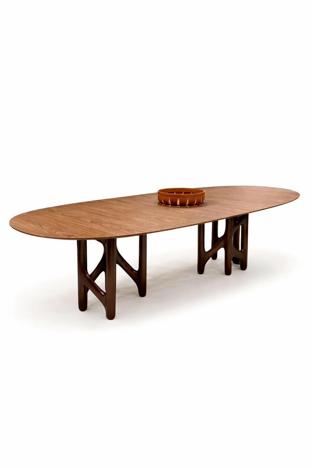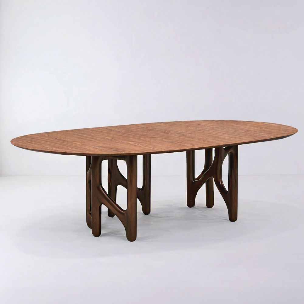 Mesa de jantar com base em fibra de vidro laqueada e tampo em lâmina de madeira.