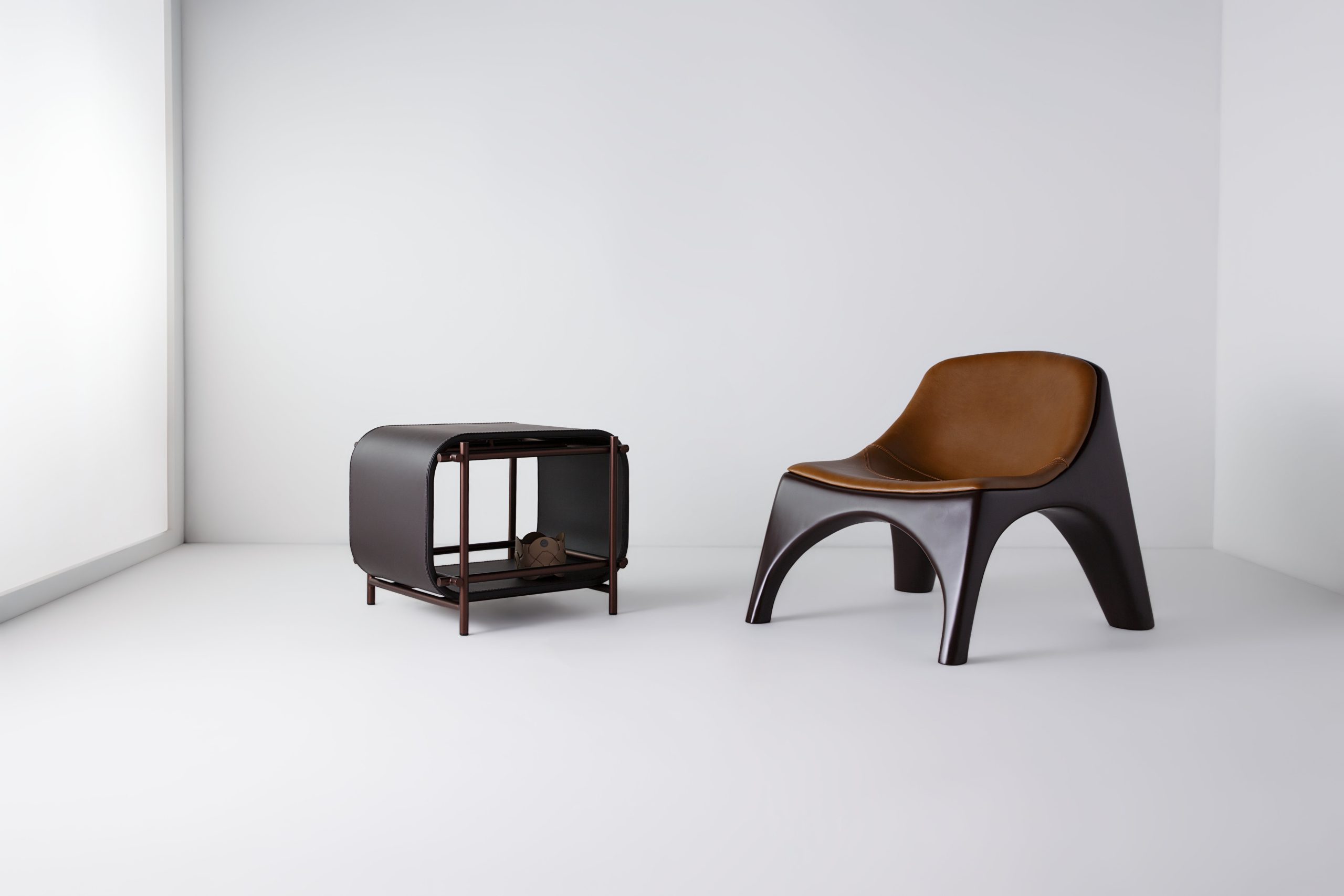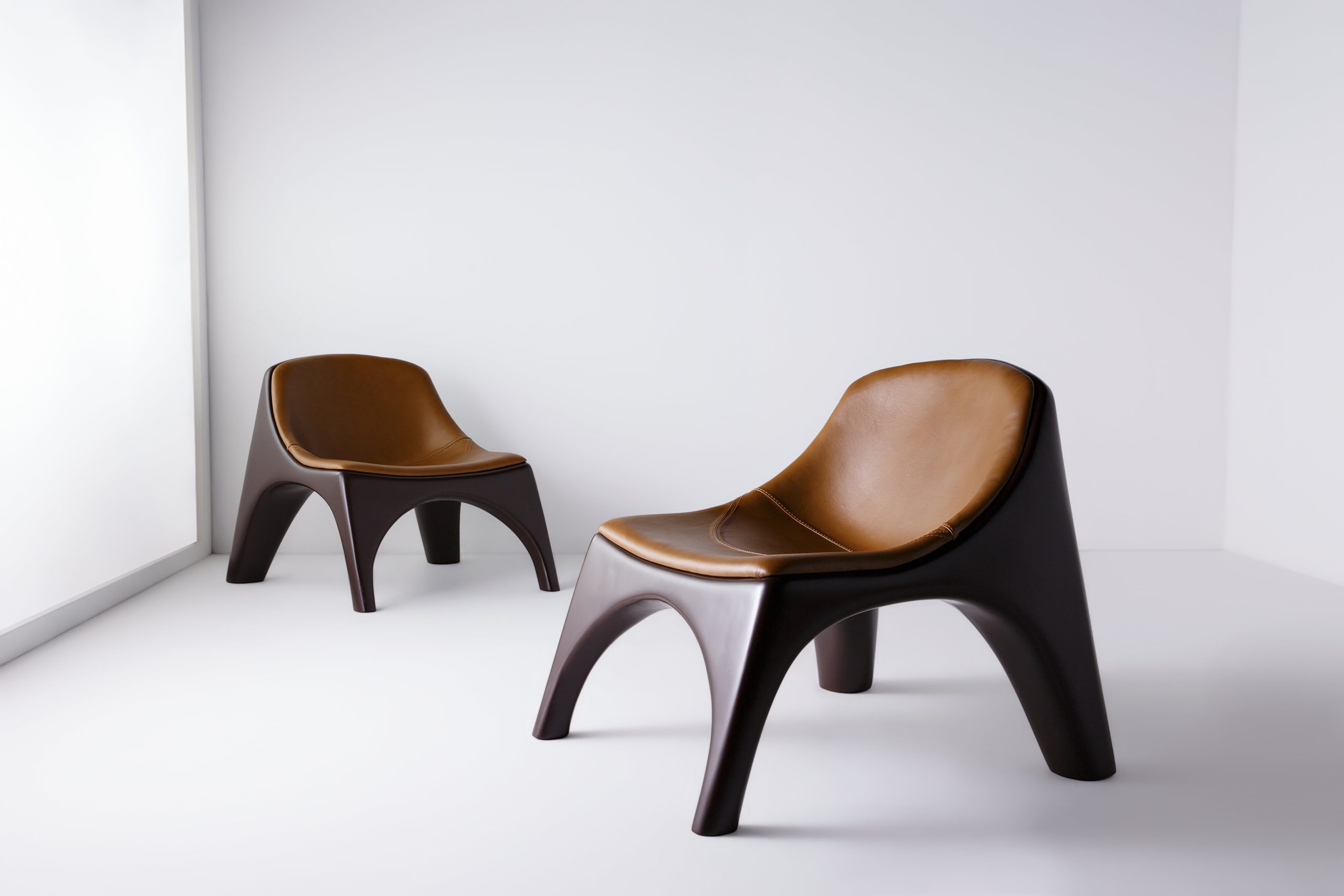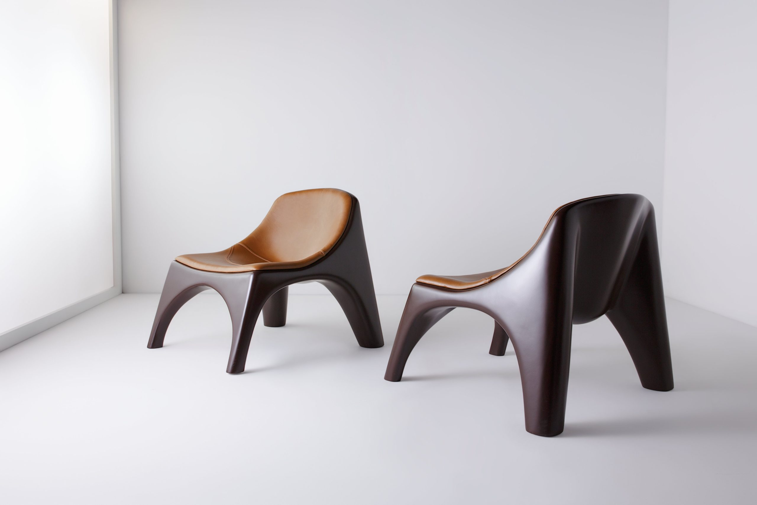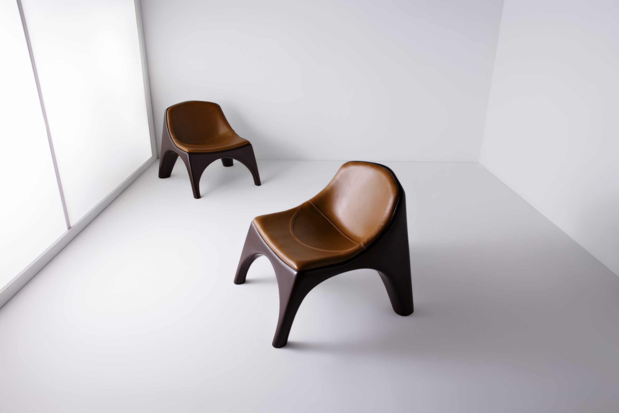 Poltrona em fibra de vidro laqueada com assento estofado.